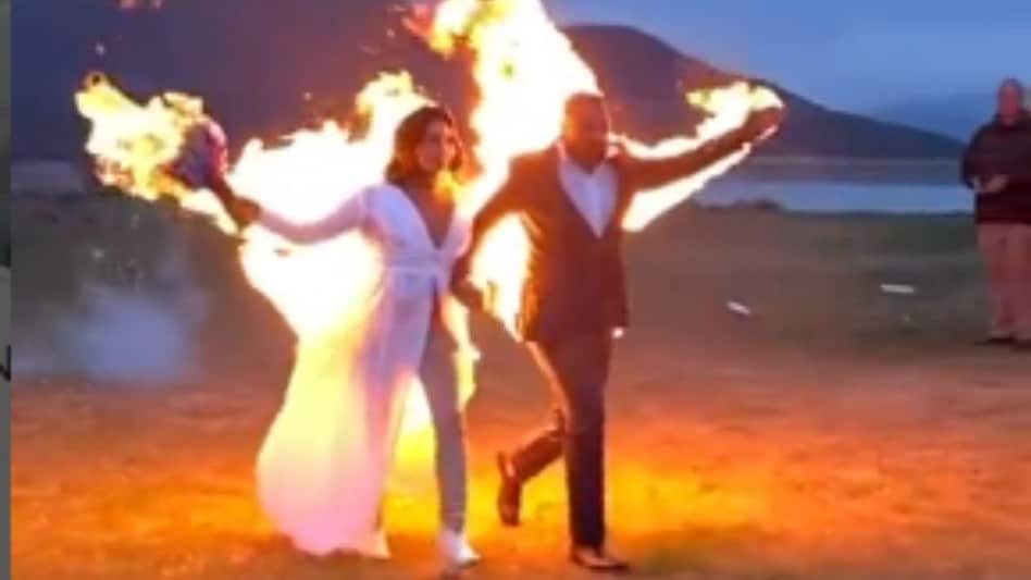 फूलों की बरसात की जगह उन लोगों ने आग से करतब दिखाया. लड़की, फायर-प्रूफ गाउन पहन रखी थी. वहीं लड़के ने सूट पहन रखा था. उन्होंने एंटी-बर्न जेल लगाया. फिर आग की लपटों के बीच वह चलते दिखें.
